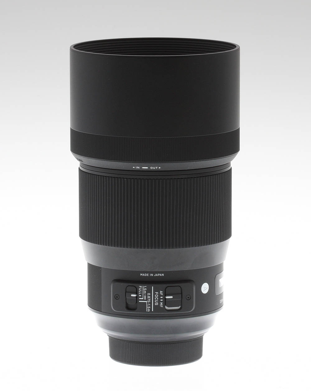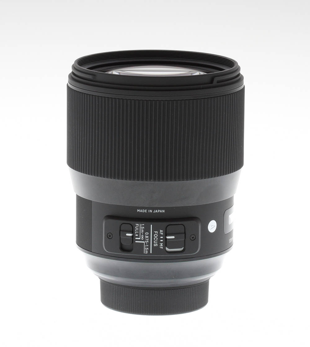 The lens features two switches, the first used to activate or deactivate autofocus on the lens. The second is a focus limiter, which has three positions: 0.875m to 1.5m (a typical portrait distance: 3 to 5 feet), 1.5m to infinity, or FULL, where there is no focus limitation. A distance scale is provided with ranges indicated in feet and meters: there is no depth-of-field scale, nor is there an infrared index marker.