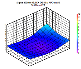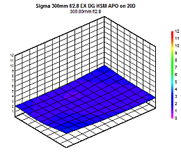 Mounted on the sub-frame Canon 20D, the 300mm ƒ/2.8 performs well wide-open at ƒ/2.8, with an average performance of 2 blur units pretty much solid across the frame. Stopping down the lens only improves sharpness results marginally, reaching 1 to 1.5 blur units in a small central region of the frame by ƒ/8, and maintaining 2 blur units into the corner regions. This isn't bad performance by any means, it just isn't the tack-sharp result we've seen on more recent Sigma lenses. Diffraction limiting begins to set in at ƒ/11, with a minor loss in sharpness; performance at ƒ/22 is still quite good at 3-4 blur units. Fully stopped-down at ƒ/32 the lens becomes quite soft, in the order of 5-6 blur units.