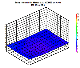 The Sony 100mm ƒ/2.8 macro is optimized to produce almost no distortion; the numbers are essentially zero when mounted on the A700. On the A900, there is a tiny bit of pincushion distortion in the corners (almost -0.1%) but this is a very small amount.