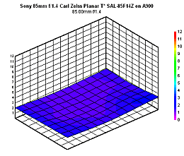Mounting the lens on the full-frame a900, again we note impressive performance. It's a very similar story to what we noted on the a700 - slightly soft wide open at ƒ/1.4, but getting very sharp indeed at ƒ/2.8. There's only a minute increase in sharpness at ƒ/4, where it's tack sharp until ƒ/11 as diffraction limiting sets in. Fully stopped down at ƒ/22, we note less than two blur units.