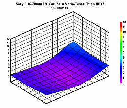 Uncorrected, the Sony 16-70mm clearly displays vignetting, especially at 16mm. At ƒ/4, it's a bit under a full 1EV of light falloff, but drops to around 0.5EV at ƒ/8. We saw a slight increase in vignetting again past ƒ/8, but still under 0.75EVs.