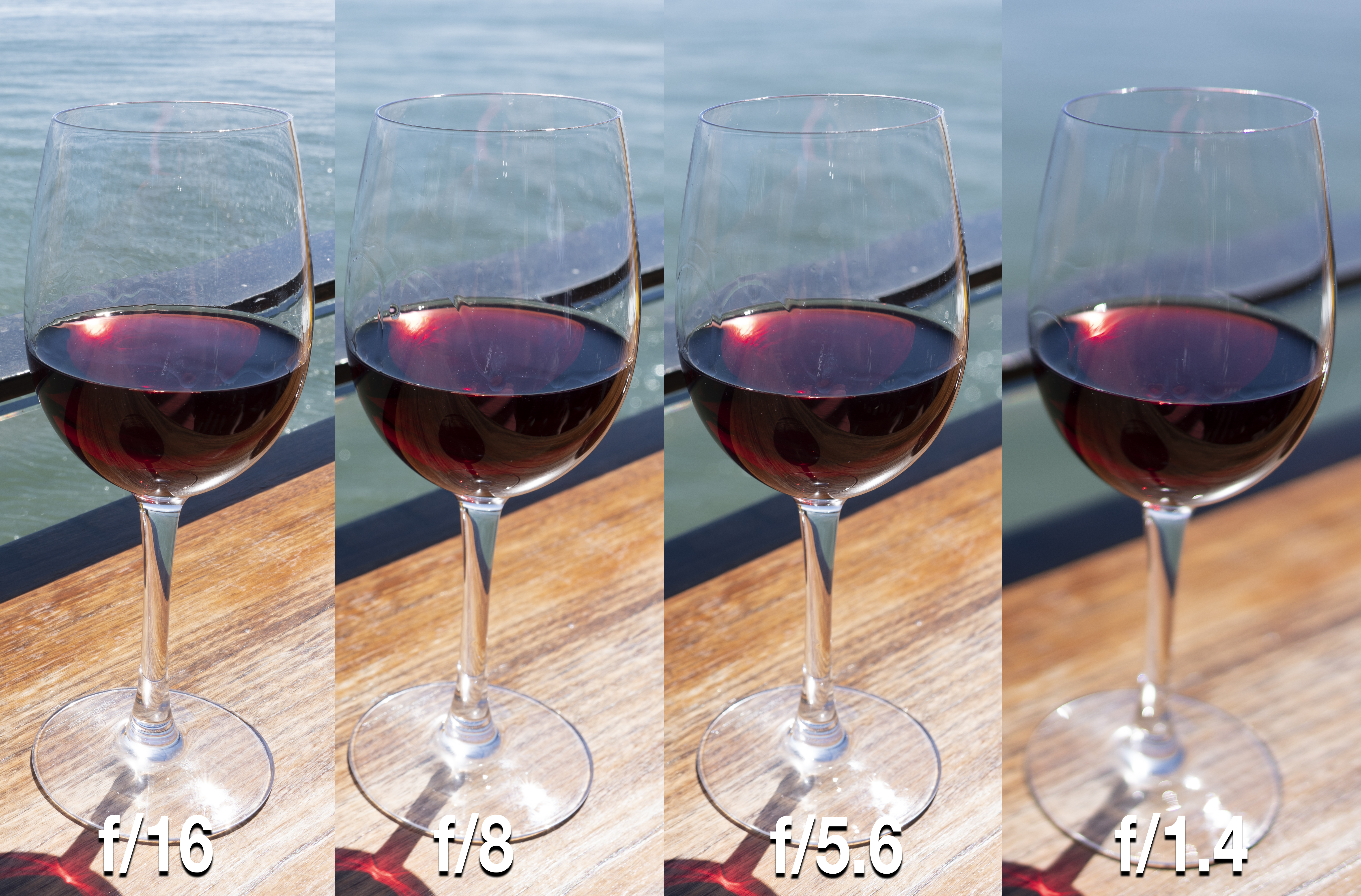 Through this whole range, you can see that the in-focus segments of all four images are basically equally sharp. That said, I will hearken back to what I said earlier about the challenges shooting at f/1.4: nailing focus can be hard. In my image here, I did get a piece of the glass in focus, but it wasn't until I got back to my desk did I realize it was the very furthest forward bit of the wine in the glass, and not the rim of the glass as I intended.