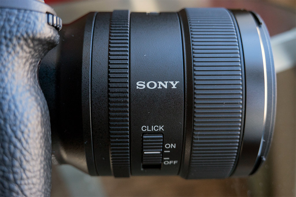 The lens also features an honest-to-goodness aperture ring. It's a high-tech version of course, being Sony, and includes a "Click" switch so you can feel the aperture changes or not, but it's refreshing to see an actual aperture ring rather than just being adjustable from the camera. The ring features 1/3 aperture increments from f/1.4 to f/16, and an "A" for automatic aperture selection. The aforementioned "Click" switch allows the user to enable or disable click-stops when selecting aperture. In video shooting this is particularly useful, as the operator can now smoothly and silently change apertures while shooting; for stills shooting, the tactile feel of changing apertures can be more deliberate.