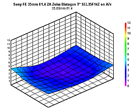 Despite being a wide-angle lens, the FE 35mm ƒ/1.4 Zeiss lens displays impressive distortion control, on both full- and sub-frame cameras. Like vignetting, Sony cameras can apply in-camera corrections for distortion. We measured both with and without, and it does appear that Sony RAW files are affected with this correction as both tests showed nearly identical results. We found average barrel distortion was well under +0.5% and even the maximum value of distortion -- typically displayed in the corners -- was still under the +0.5% level.