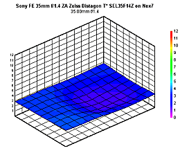 At ƒ/1.4, we weren't surprised to find significant vignetting on full-frame cameras. As we found when testing the 35mm ƒ/2.8 version, Sony RAW image files will have vignetting correction baked in if this option is enabled in the camera. We've tested the lens both with and without vignetting correction, and we found that there is a marked improvement in vignetting with the correction enabled. The graphs here in this review, however, represent the level of vignetting without correction applied.