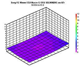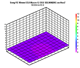 The Sony 90mm ƒ/2.8 macro is optimized to produce almost no distortion; the numbers are essentially zero when mounted on the NEX-7. On the A7R, there is a tiny bit of barrel distortion in the corners (almost +0.2%) but this is a very small amount that's easily correctable.