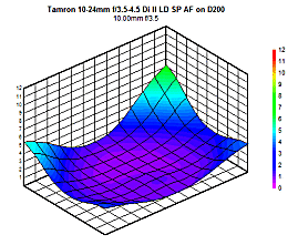 Wide-open (largest aperture) performance is very good, more so at the wider end of the zoom range; there's a large ''sweet spot'' of sharpness in the center of the frame, offset by significant corner softness. As the lens is zoomed in towards 24mm, central sharpness degrades significantly. The worst of it shows at around 18-20mm, where average sharpness is in the order of 3-4 blur units across the frame, but things improve marginally by 24mm. It's clear Tamron has optimized the lens for wide-angle usage, though - which makes sense, given its 10mm focal length capability is a prime selling point.