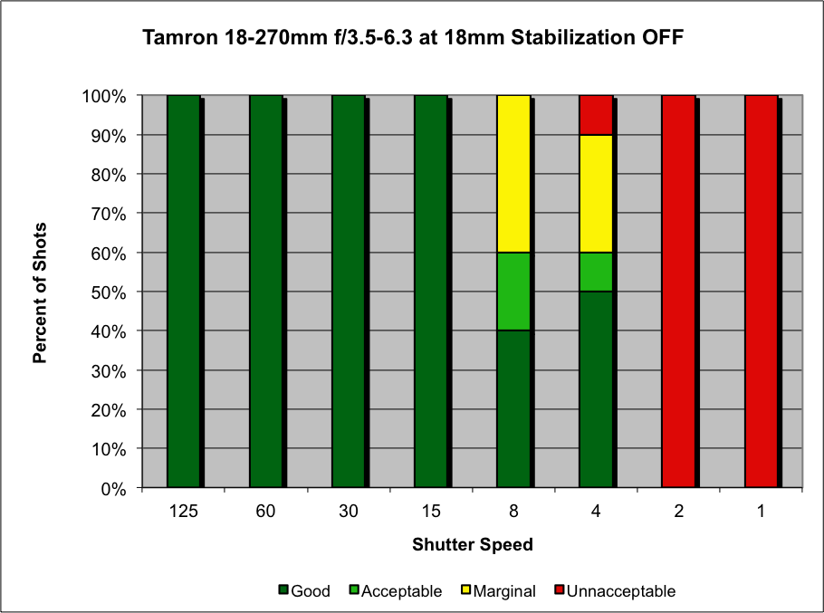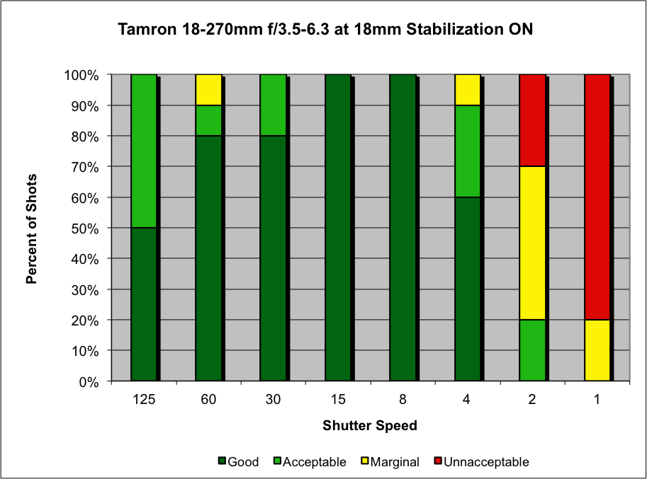 At the 18mm end, We saw some decrease in ultimate sharpness at higher shutter speeds, with 50% of our shots at 18mm and 1/125 second falling into the Acceptable ranking vs "Good." We got one each (out of ten shots) ranked Acceptable and Marginal at 1/60 second, and two shots ranked Acceptable at 1/30. Hand-held, all our shots were Good down to 1/15 second. Where the IS really shone was at shutter speeds fo 1/8 and 1/4 second, where all (1/8s) or most (1/4s) of the shots were Good, with only one shot dipping to Acceptable at 1/4 second.