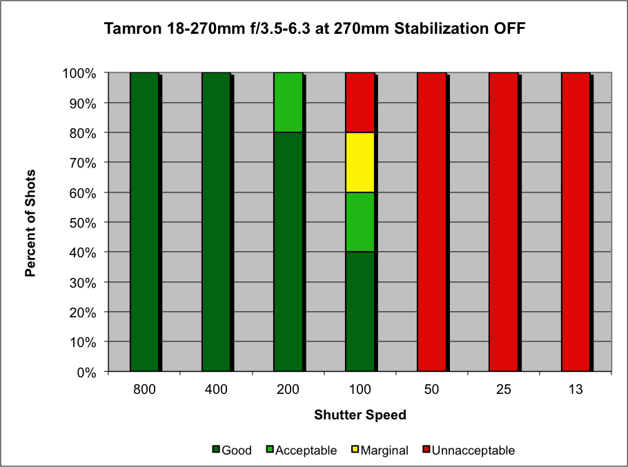 So how is it that others have so effusively praised this lens' IS performance? We think there are two possibilities. There's always the chance that we got two lenses with problematic IS systems, but that seems pretty unlikely, as they were both very new-looking stock, with no evidence of any damage or rough handling. What's more likely the case is that the lens performs better for people who are unsteady shooters to begin with. Lead lens tech Rob (who does all our IS tests) is a very steady shooter, as witness that 40% of his hand-held shots at 270mm had Good sharpness when shooting at 1/100 second on our 7D test body. That's a really slow shutter speed for hand-held shooting at that focal length. (With the 7D's 1.6x crop factor, 270mm equates to a full-frame equivalent focal length of 432mm.) We've found in the past that some IS systems provide much more benefit to very shaky shooters than they do for very steady ones. It's possible that the Tamron 18-270mm f/3.5-6.3 VC PZD is one such.