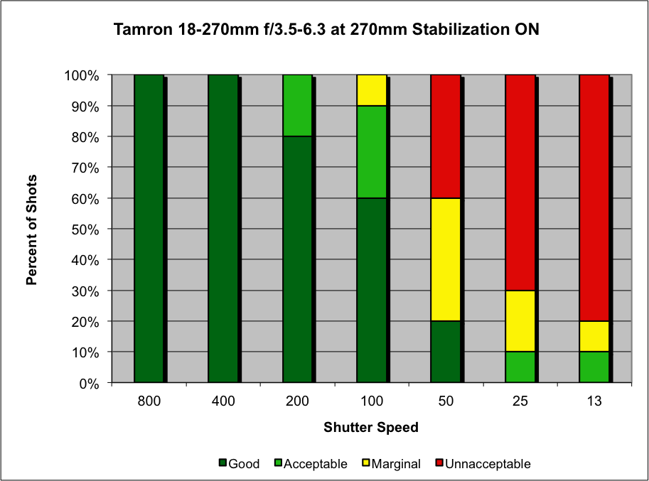 The good news is we're pretty confident that any photographer will see at least a one f-stop improvement in shake reduction with this lens at 270mm. There's a good chance that shaky shooters will find even more improvement.IS systems tend to provide more benefit to less-stable shooters than very steady ones, so most users will see the same or greater amounts of shake reduction as we measured here. You can read more about our IS test methodology here: SLRgear IS Test Methodology, v2.