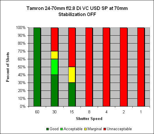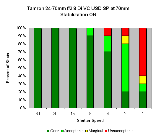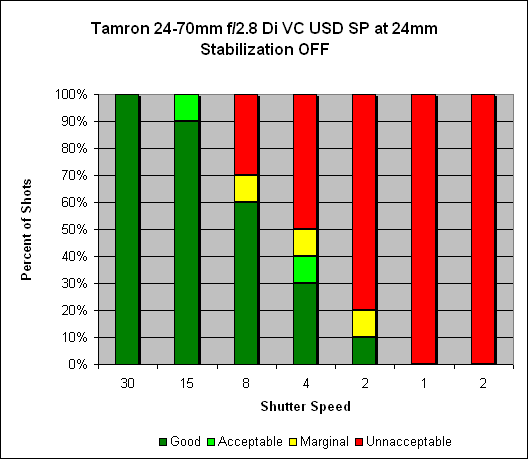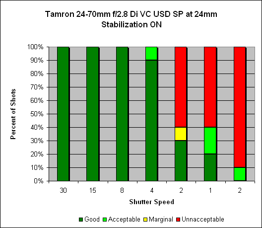 At 24mm, we see what we would expect with image stabilization deactivated - 100% sharp shots at 1/30s. With VC activated, we see 100% sharp shots all the way down to 1/8s, with 90% at 1/4s, meaning somewhere around three stops of hand-holding improvement.