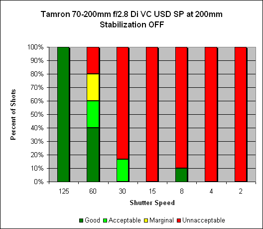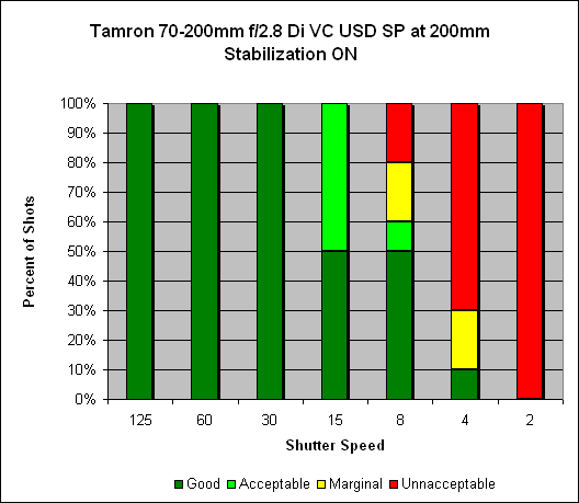 Zoomed in to 200mm, we see around 3 and a half stops of hand-held improvement - with a bit of a caveat attached. With VC disabled, we're already getting good hand-held performance - the rule of thumb holds we should be getting sharp shots starting at 1/200s, but Rob was getting 100% sharp at 1/125s - and with VC activated, we get sharp shots all the way down to 1/15s, and 50% sharp at 1/8s. The caveat is that only 50% of the shots at 1/15s are acceptably sharp. So as with most things in life - your mileage may vary.