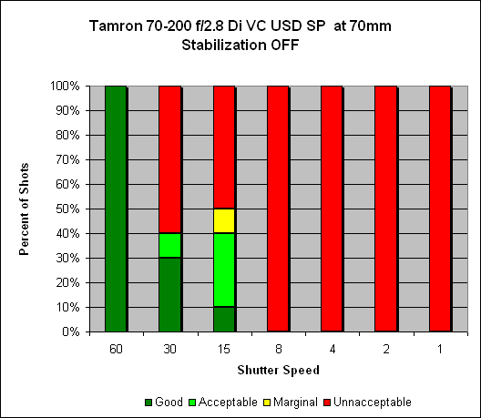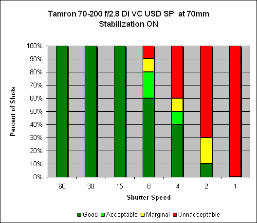 At 70mm, we see around two and a half stops of hand-held image stabilization with VC activated. We can see that with the system disabled we get 100% sharp images at 1/60s, on par with the "one-over-focal length" rule of thumb; with the system activated, we get 100% sharp shots at 1/15s, and 60% sharp at 1/8s.