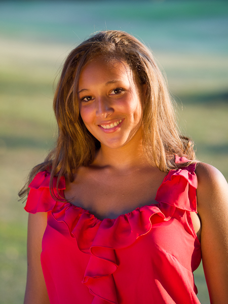 Finally, to illustrate that bokeh again, we went out into the back yard and my son held the reflector for that sun-on-the-beach look. This was shot at f/1.8. I find it just right, though I was expecting it to be too soft in one eye compared to the other. But only the hair falling off her right shoulder is soft, pleasantly so. And the background is like butter. Yes, that's a deep grassy field in evening sunlight behind her. I only had moments to make this shot, as my son was late going to bed and we were late for an appointment. I'd have had my young boy hold the reflector about two feet higher, but I'm still pretty pleased with the image considering the time we had.